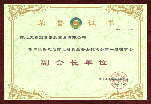 “源于自然,享受綠色”是公司服務于社會始終如一的追求目標。近年來公司先后榮獲“中華名優新特農產品先進單位”、“中國優質食品安全單位”、“中國果品協會理事單位”、“河北省果品流通協會最佳會員單位”稱號。